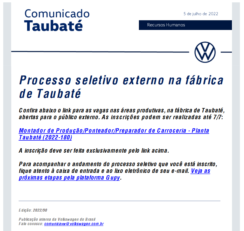 Confira abaixo o link para as vagas nas áreas produtivas, na fábrica de Taubaté, abertas para o público externo. As inscrições podem ser realizadas até 7/7: