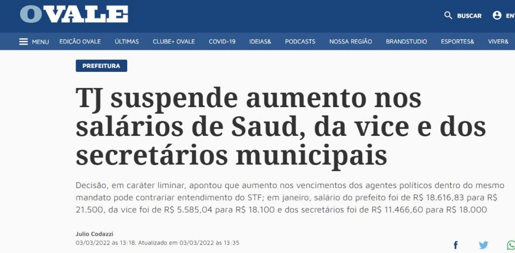 A justiça suspendeu os aumentos de salário do prefeito, da vice-prefeita e dos secretários. É a vitória da justiça, do bom senso e do povo de Taubaté. Obrigado às 15 mil pessoas que assinaram a petição contrária a esses aumentos. Sem vocês não teríamos conseguido.